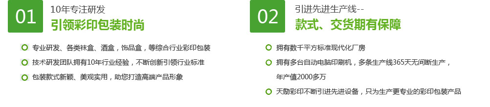 義烏市天勵彩印包裝廠,位于中國小商品城-義烏,公司專業生產各類襪盒、酒盒,飾品盒,瓦楞盒,吊卡,工藝品包裝盒,義烏地區彩印包裝,彩盒包裝加工,紙盒包裝,紙箱加工等,工廠位于義南工業區,公司是國家一類彩印包裝生產企業,擁有德國進口海德堡印刷機,單面瓦楞機組,裱紙機組,全自動覆膜機,加重加大壓痕機,燙金機為一體的生產企業。至今已有多年的生產制造經驗,技術力量雄厚,加工設備先進,專業化程度高,具有雄厚的企業實力。我廠堅持以質量求生存,以科技求發展,博采眾長,融合國內外機械之精華精心設計自己的每一件產品,確保產品生產工藝嚴謹,歡迎來樣訂做。